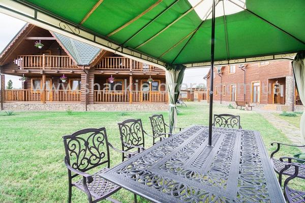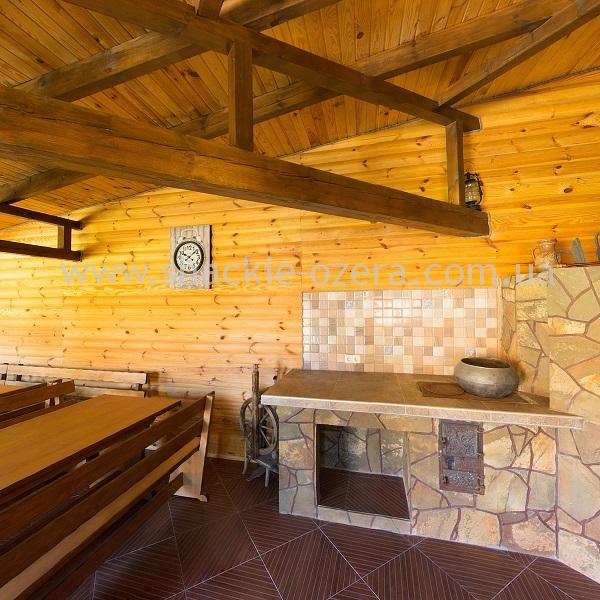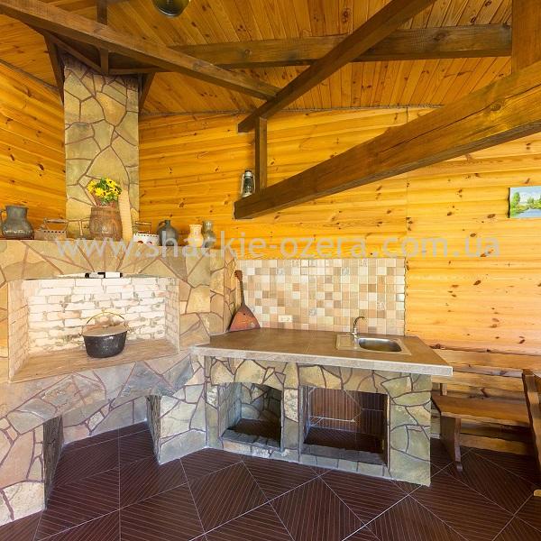 - крытая деревянная беседка с камином, плитой на которой можно приготовить пищу на открытом огне, мойкой. Большие деревянные столы и лавки разместят всех желающих;