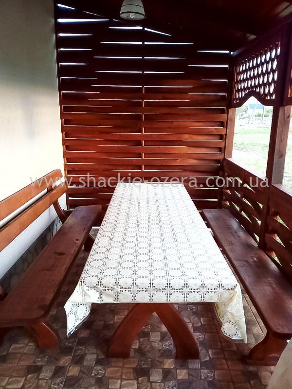 Перед домом крытая терраса со столом и скамейками.